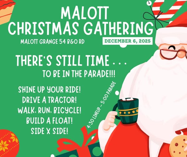 Join in the parade in Malott along with Santa. 4:30 line up, parade starts at 5:00. Meet Santa at the Grange Hall after for some snacks, cocoa, cookies, candy canes & a picture.