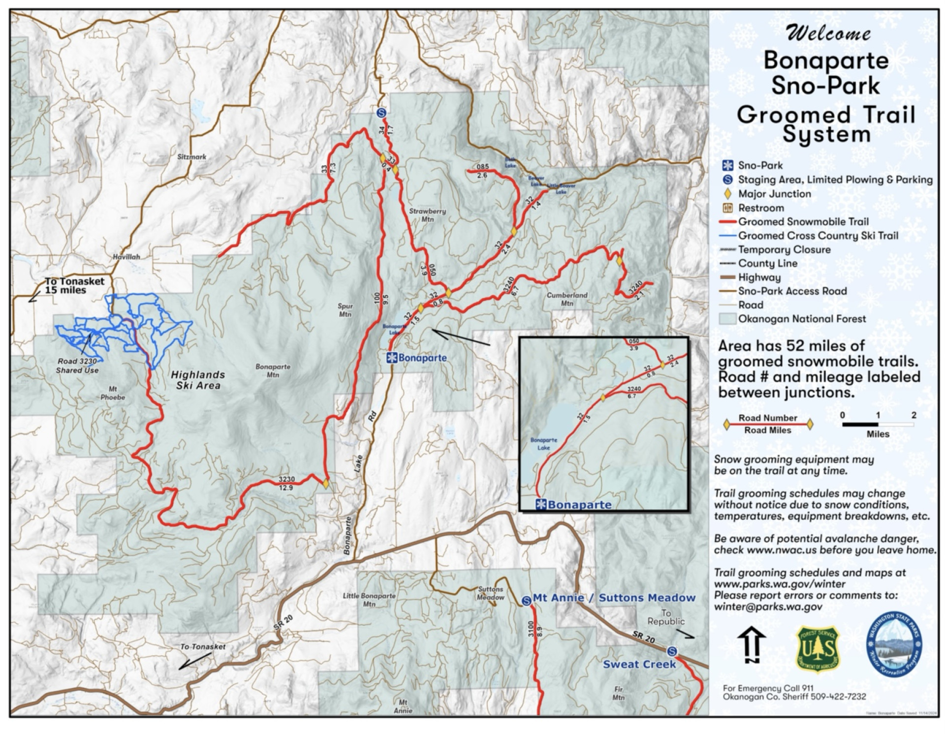 20 miles from Tonasket via Highway 20 (eastbound), then 7 miles on Bonaparte Lake County Road. The Sno-Park is approx. one mile south of the Bonaparte Lake Resort.