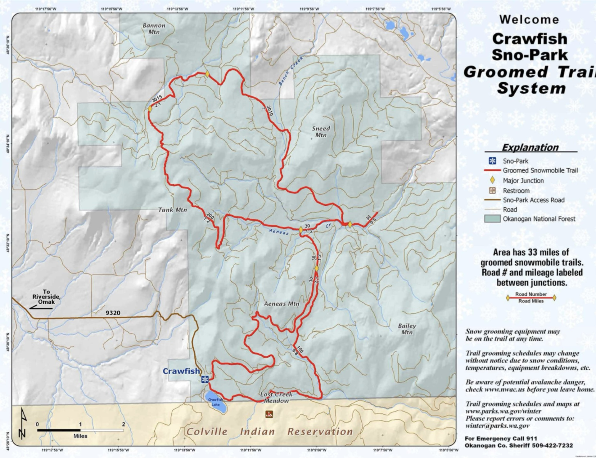 Crawfish Sno-Park is a motorized sno-park located about 1 mile from the Crawfish Lake Campground in the upper Tunk Valley, 20 miles from Riverside, Wa.